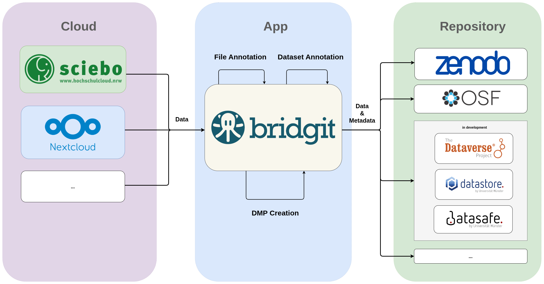 But specifically, bridgit is mainly designed for three main groups: researchers across all disciplines at universities and institutes who need secure data management, academic institutions who want to extend their (e.g.) Nextcloud environment with a research-focused solution and non-academic companies who are interested in integrating or extending bridgit to meet specific organizational needs (or connect their work to the scientific community).