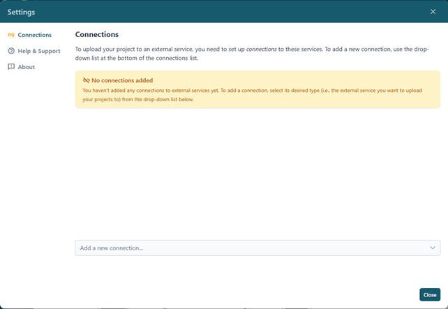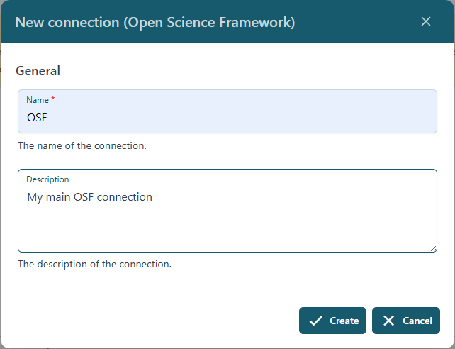 From the Add a new connection drop-down list, select which external repository you want to connect to, and a dialog where you can name and optionally describe your new connection will come up:
