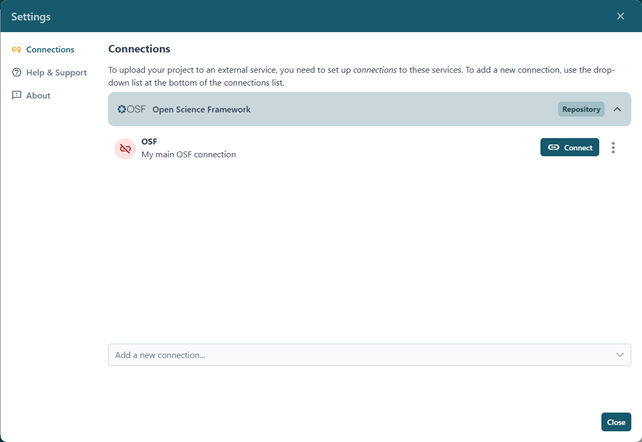 Before creating any projects, you will connect bridgit to external repositories of your choice (e.g. Zenodo, OSF, etc.) which you want to upload your datasets to later on. Connections are managed within your user settings, which you can open by clicking the little cogwheel icon in the top-left corner of bridgit’s interface. This will bring up a list of all your set up connections. This list will be, of course, initially empty – so scroll down and find the connect button to set up your first connection.