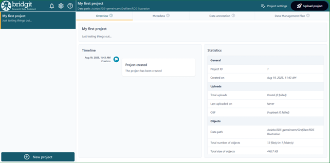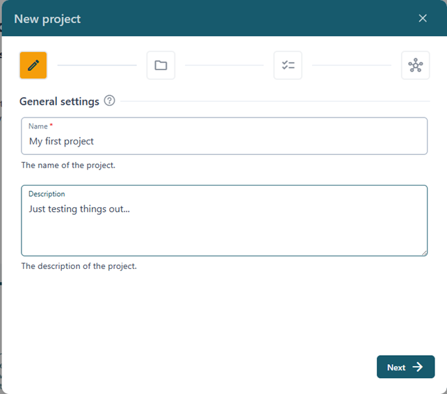 On this first page, you can give your project a name and add a short description. The name helps you easily identify the project later, while the description provides context about its content, purpose, or stage of progress. Taking a moment to add clear information here will make it easier for you and your collaborators to keep track of your work.