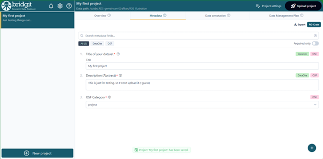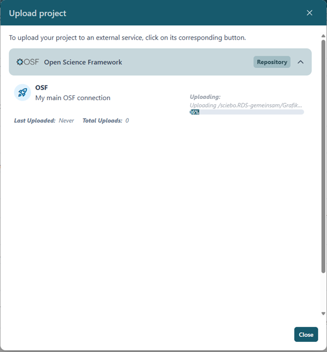 To upload your project to a specific service, simply click on its corresponding Upload button. bridgit will now upload all data that belongs to your project, including its files and metadata, to the external repository: