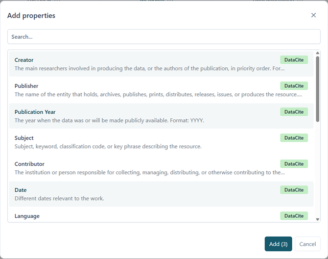 Each project has its own general metadata that can be entered in the Metadata tab, as shown above. By default, only a small number of available properties will be shown, but more can be added by clicking on the little + sign in the lower right corner. You can select the properties you want to add to your project. By clicking on this +, a pop up will provide you with the following dialog: