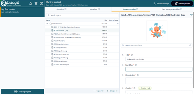 The file tree on the left displays all files and folders included in your current project. To add metadata, simply select one or more files or folders and enter the information you want. For many common file types, a preview is also available, making it especially easy to annotate images, documents, and other visual content.