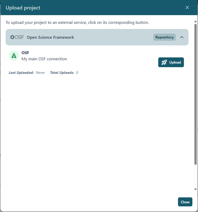 Once you have completed the editing of your project, it is time to upload it to an external repository like Zenodo or OSF. To do so, click on the Upload project button in the top right corner of bridgit, which will bring up the following dialog:
